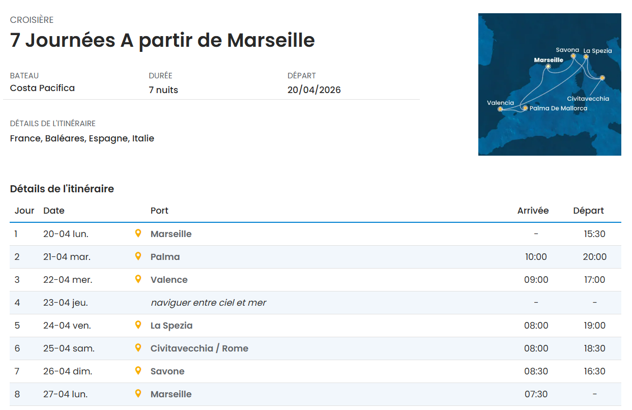 Depuis le port de Marseille, embarquez pour 7 nuits au bord du Costa Pacifica puis laissez vous guider : Palma de Majorque, Valence, La Spezia, Civitavecchia, Rome et enfin Savone !